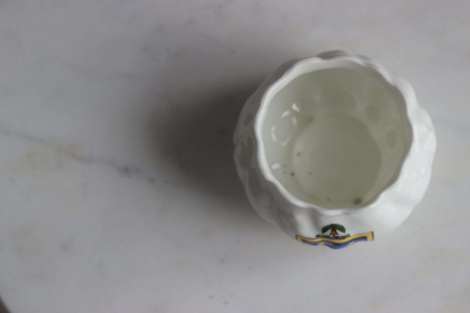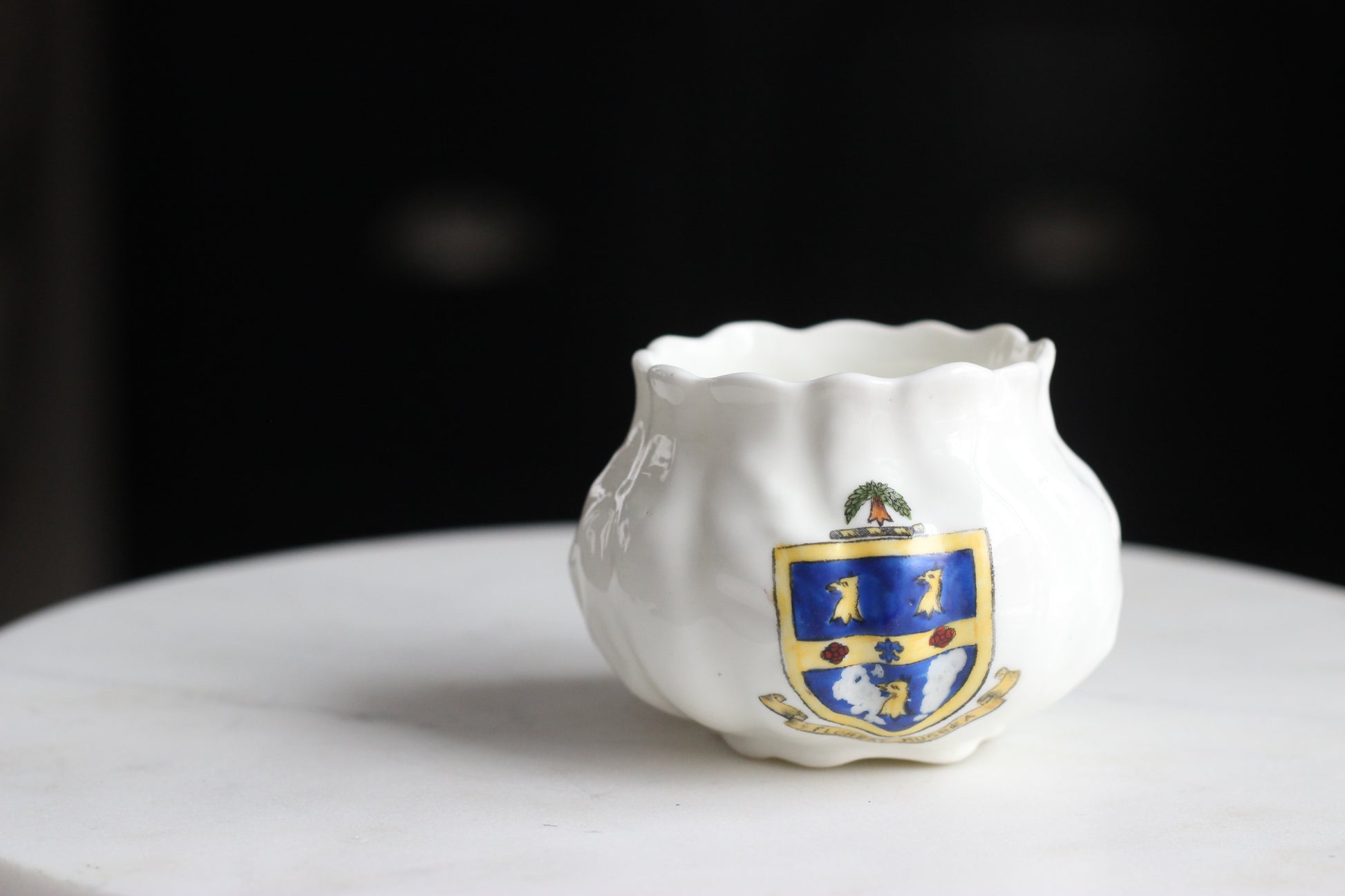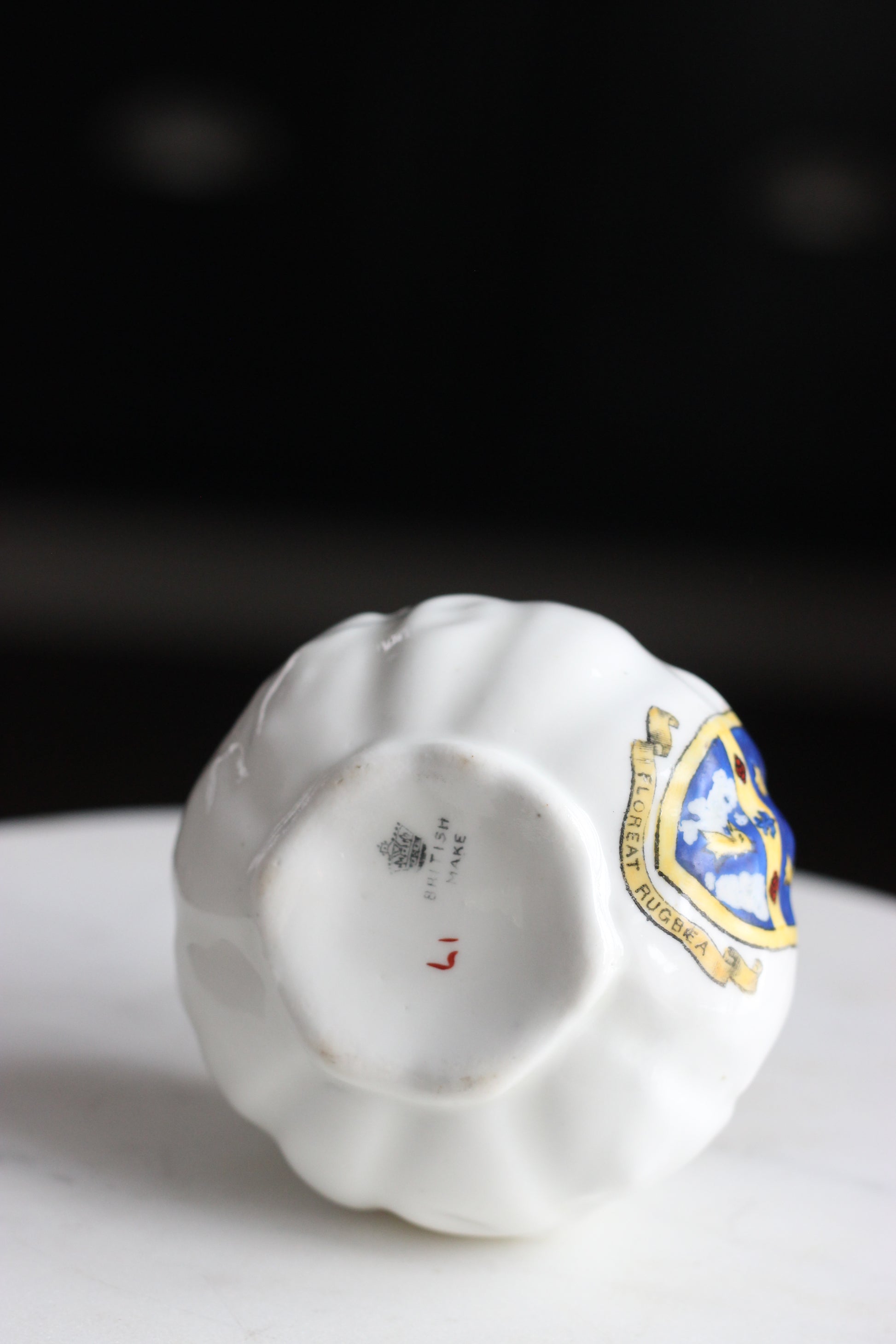Antique | English/Rugby School Coat of Arms Souvenir Bowl | toothpick or match holder | porcelain | Reads “floreat rugbea” - translates to “let rugby flourish” | stamped with British make & crest, along with a hand painted 17 | approx 3”w x 2.5” tall