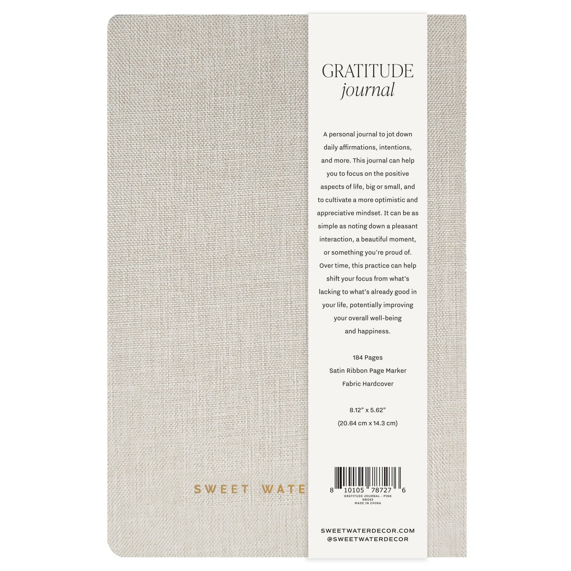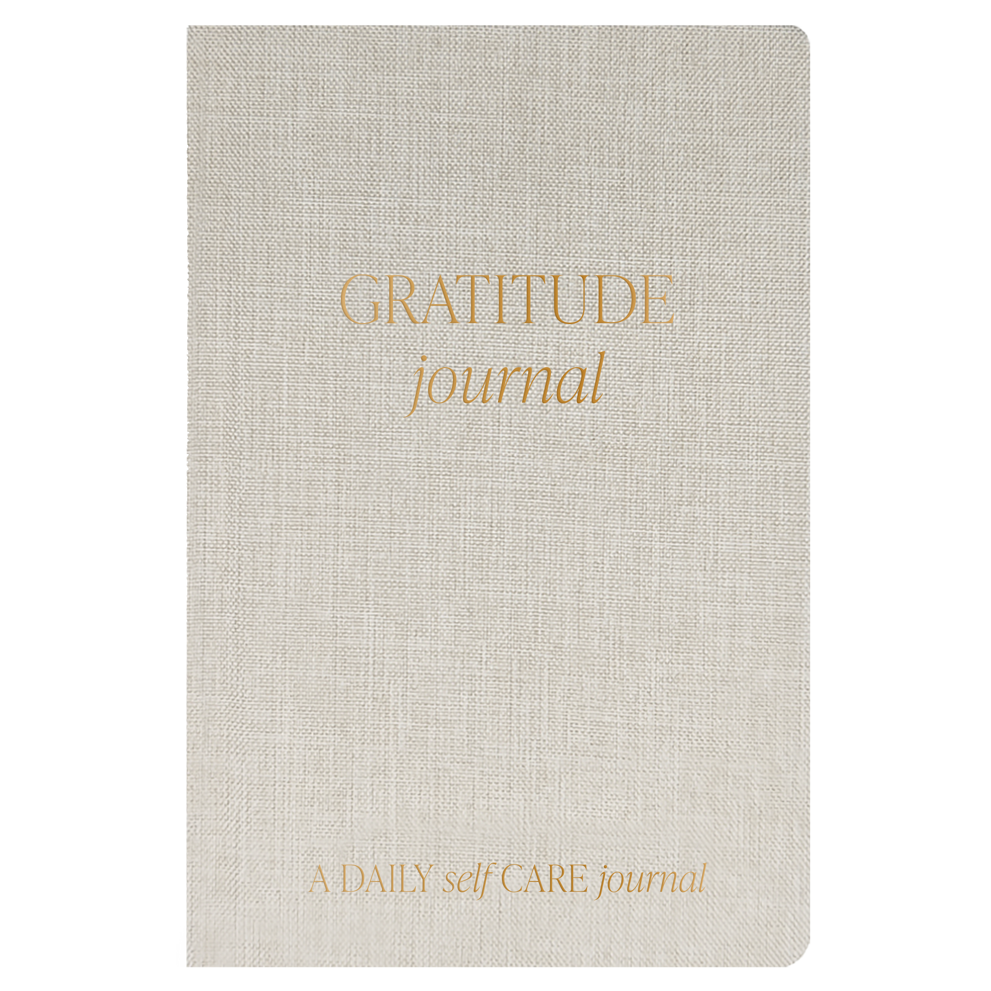 DETAILS: • Size: 5.75" x 8.25" x .65" • Design: Gratitude Journal (with prompts) • Tan Fabric Journal with Gold Foil Details • 100gsm Uncoated Lined Paper • Satin Ribbon Bookmark • 184 pages front and back - 1 Year of Prompts
