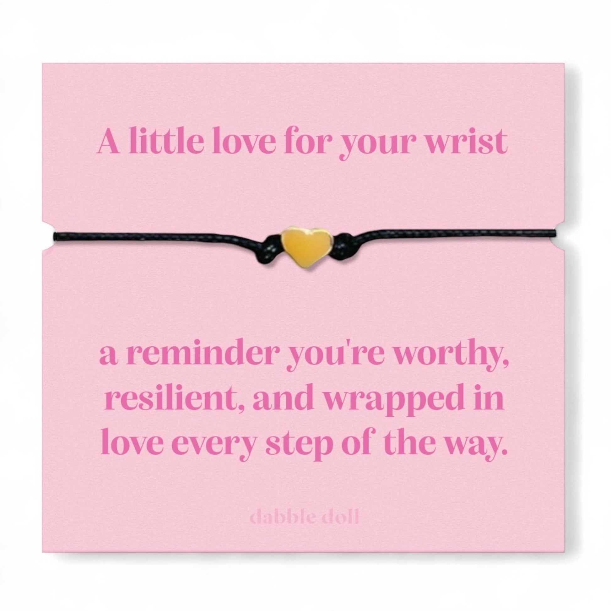 Gold Heart Cord Bracelet – “A Little Love” Message Card featuring a delicate gold heart charm on an adjustable cord, this piece comes displayed on a premium backing card that reads: “A little love for your wrist — a reminder you’re worthy, resilient, and wrapped in love every step of the way.”